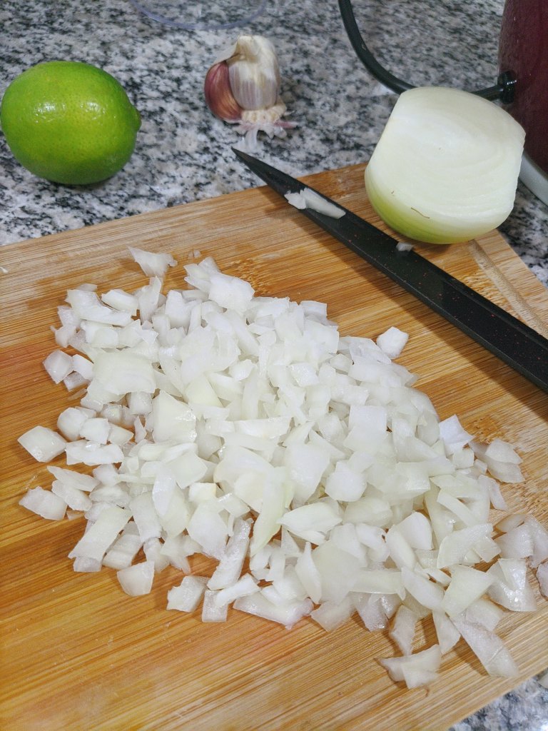 Coloque a batata para cozinhar e pique uns dentes de alho, quanto mais melhor, não vou falar em que estilo picar, tanto faz a essa altura do campeonato, a atenção deve ser toda em não cortar os dedos, e jogue esse alho em cima do filé, vai ficar aí marinando; pegue a cebola e pique também, não preciso repetir, quanto mais melhor, meu purê é assim, cheio de pedacinhos de cebola, crocante, puro de coração, reserve essa cebola picada enquanto avalia se pica mais ou não; agora que a batata ainda está cozinhando e não há mais o que fazer aumente a música, beba mais um gole e dance, torne sua noite bonita como num filme, pratique o joie de vivre, a alegria de viver, perceba o cheiro bom da cozinha agora, não pense tanto na quantidade de louça pra lavar mais tarde.