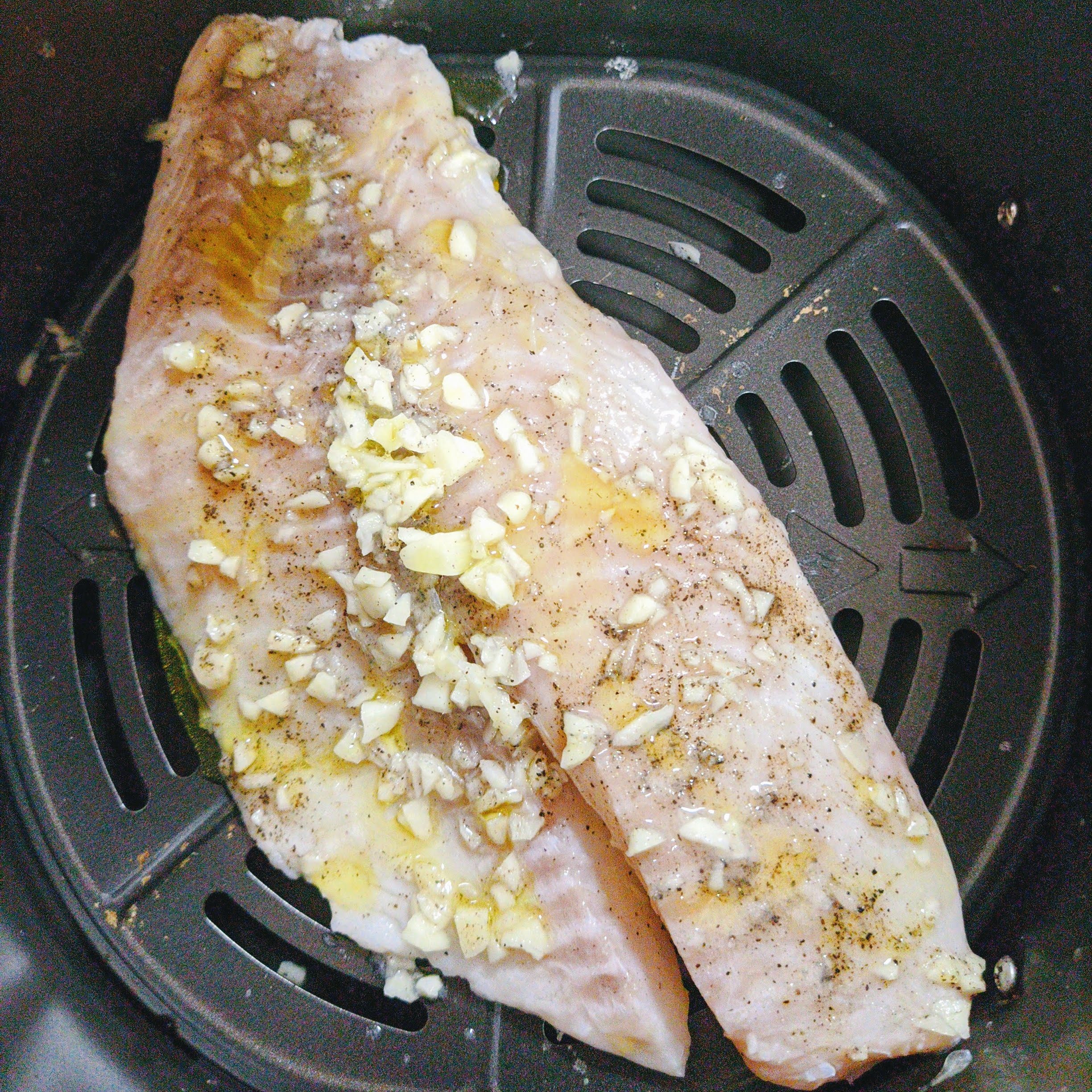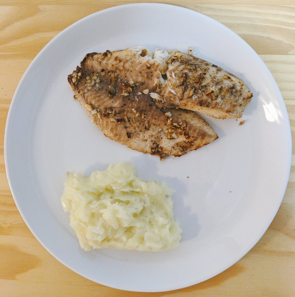 A tilápia acabou de apitar, se estiver do seu agrado tire, senão deixe mais, não exagere no tempo, é um peixe, não um peru, mais uma vez respeite a memória do peixe, tire da airfryer sem quebrar o filé, espero que consiga, dessa vez eu não consegui, sinta o cheiro do purê e alegre-se com sua textura, está pronto. Sirva-se.