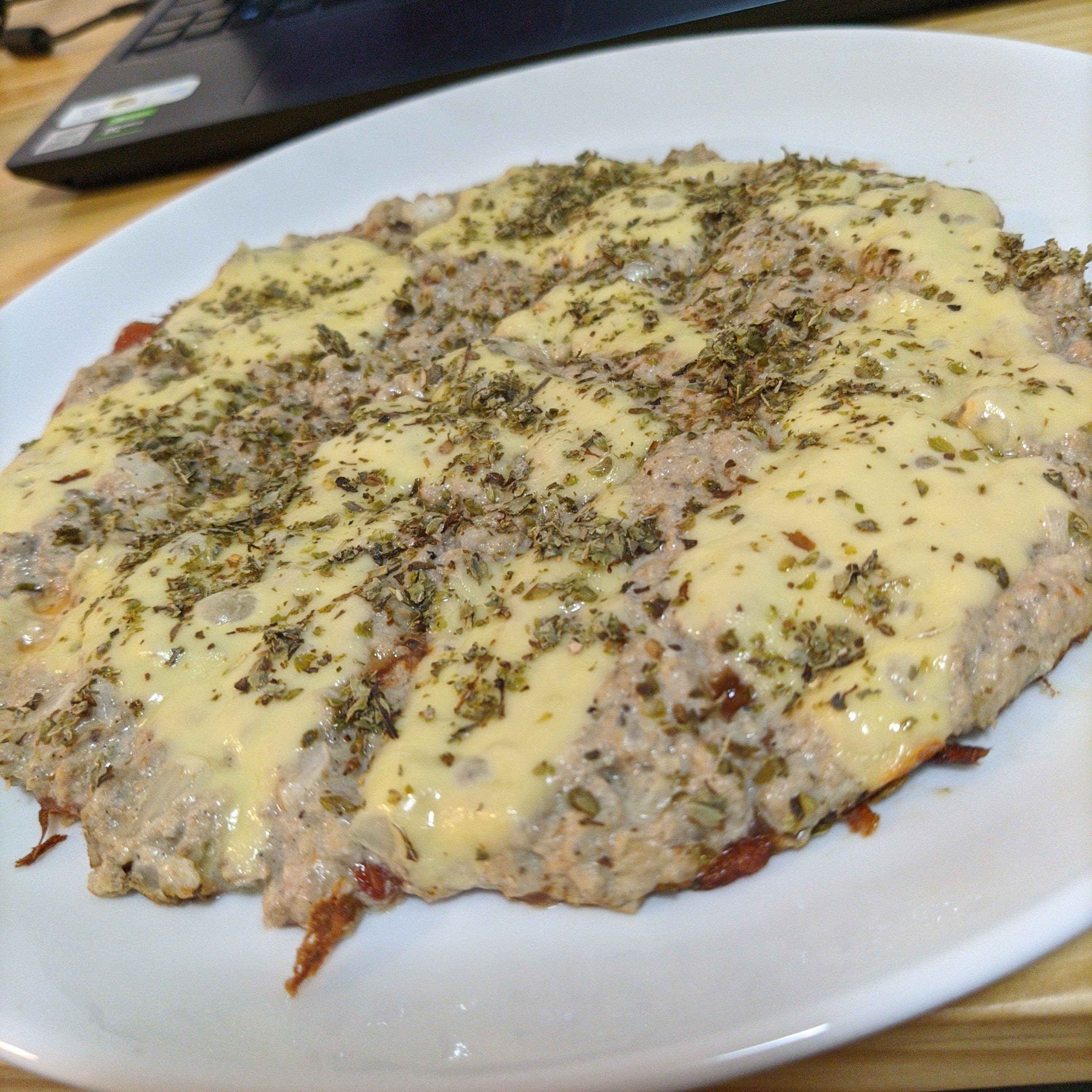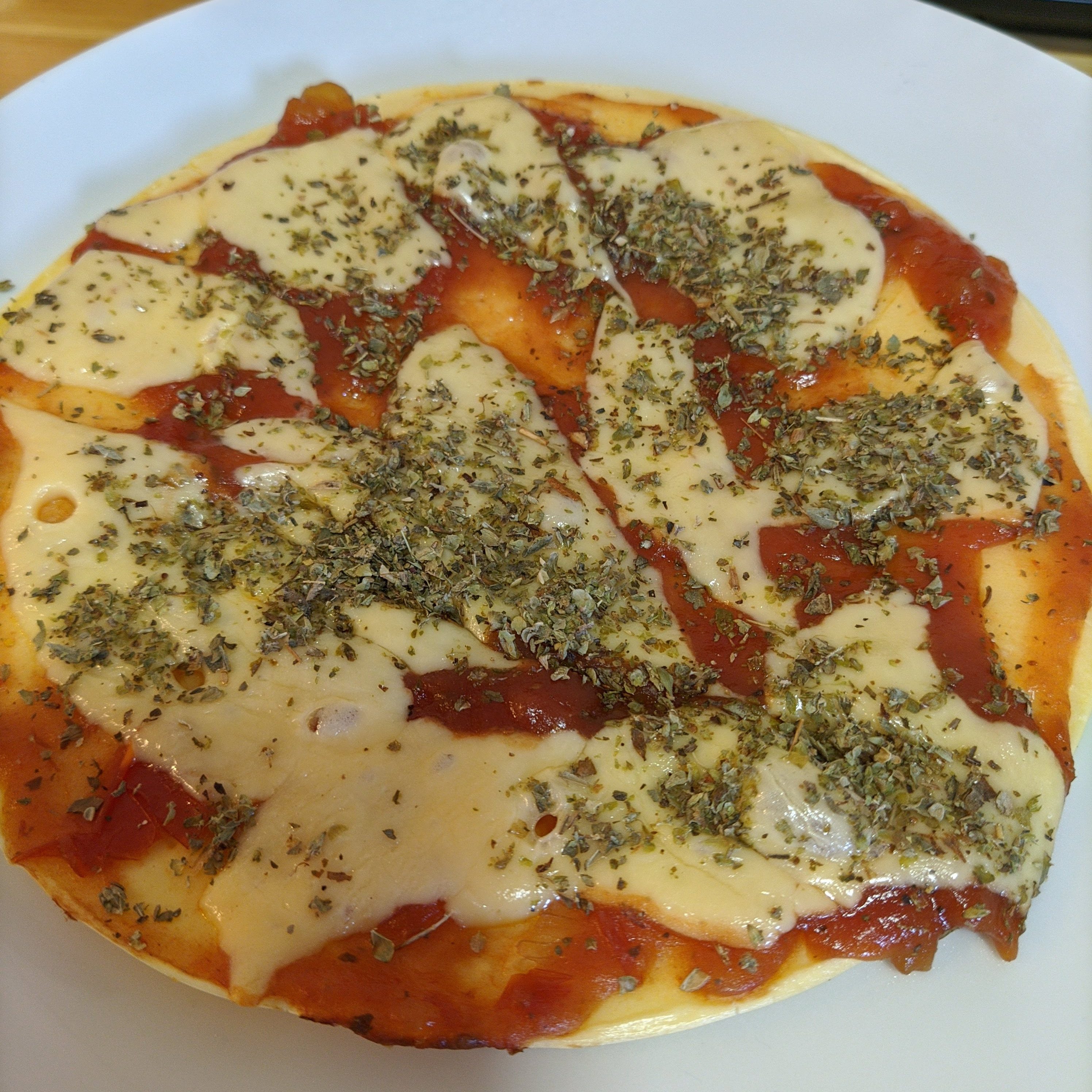 Vi na internet que se você juntar 1 ovo, 40g tapioca, 15g requeijão e uma pitada de sal isso dá uma (crepioca) base para pizza de frigideira, fiz, botei molho de tomate, 1,5 fatia de queijo prato, um tanto suficiente de orégano, virou isso.