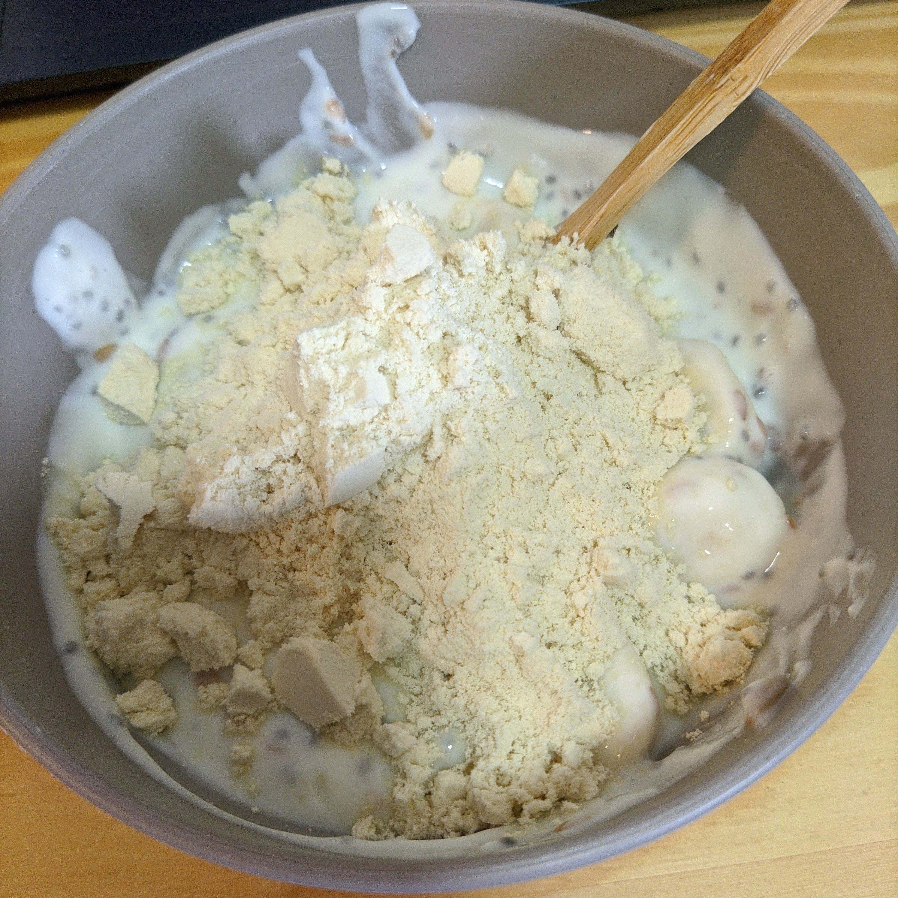 Isso não é nem receita, tá de safadeza, coloque o iogurte natural na tigela, corte uma banana em rodelas, coloque toda sorte de chias, linhaças e sementes junto, misture tudo e depois despeje uma dose de whey por cima, não misture, coma como se fosse um açaí com leite em pó, bata sua meta de proteínas do dia.