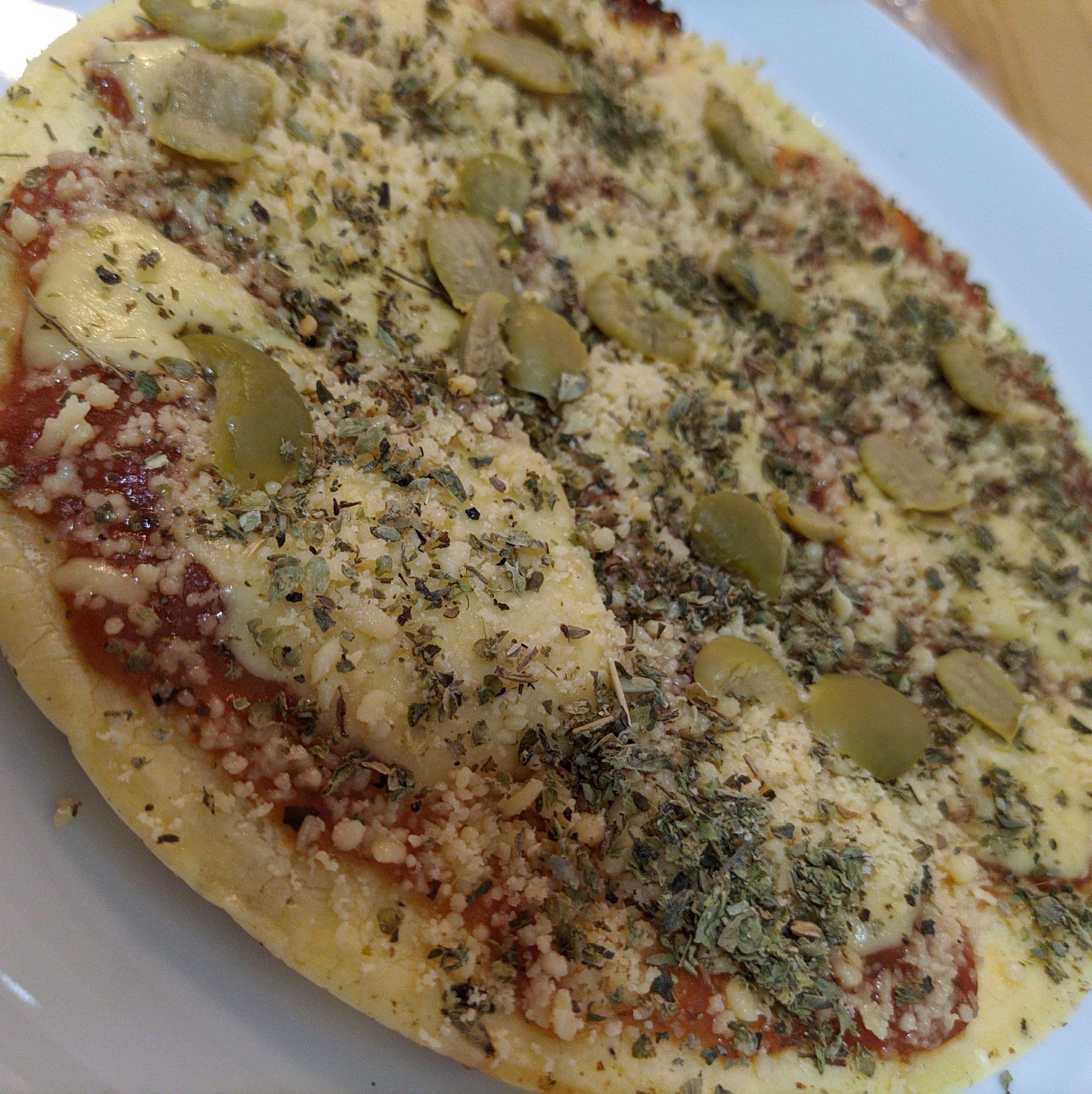 Assim que eu me lembrei outros ingredientes que vão numa pizza, resolvi fazer essa versão com azeitona e parmesão ralado (só tinha 1 fatia de queijo prato na geladeira), e resolvi colocar um tiquinho de fermento pra ver se a massa dava uma inchada, acho que ficou ótimo.