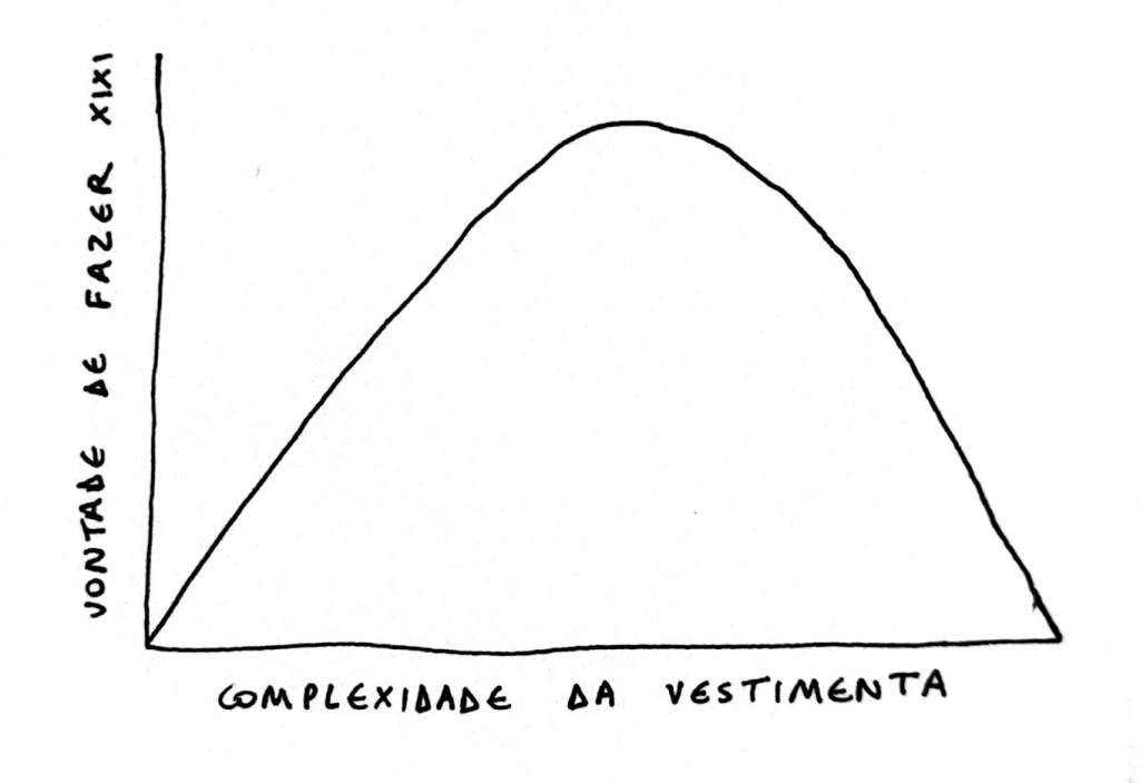 No rabisco que fiz, minha frustração com a roupa que usei na quarta-feira, acompanhe, se tirar e colocar o look de volta for complicado demais, chega um momento em que você prefere deixar de beber água para não ter que ficar indo ao banheiro toda hora: