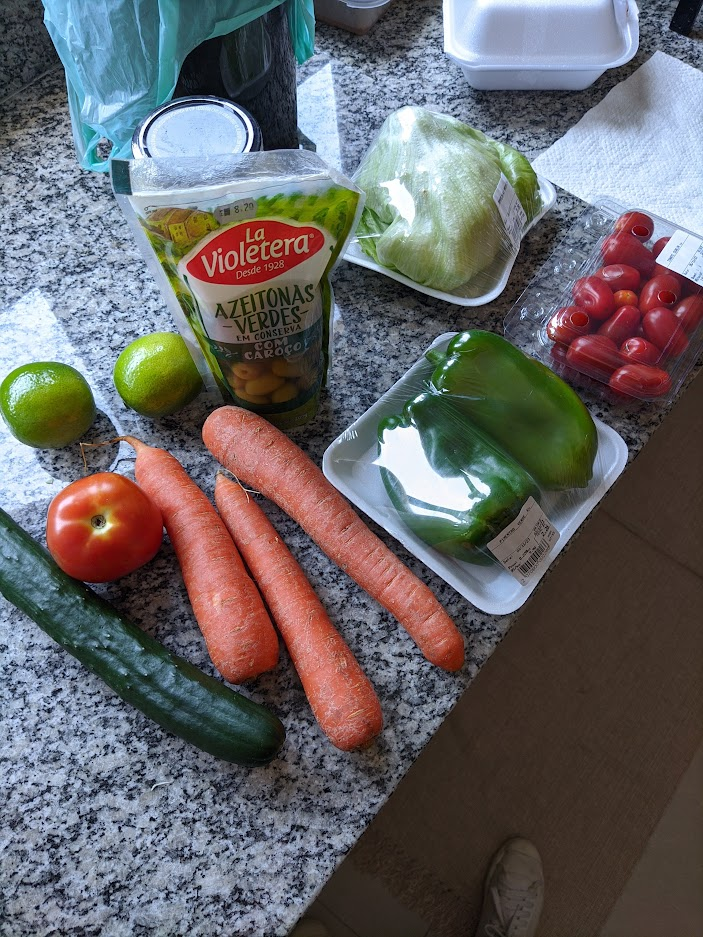 Com as cenouras, tomate, pimentão e outros alimentos que chegaram depois (jiló e abóbora) eu comecei a preparar, e aqui digo comecei porque eu não tinha ideia do trabalho que isso daria com apenas um fogãozinho elétrico e um mini-liquidificador, uma versão vegana e aprovada para FMD do caldo que minha mãe faz, e posso disponibilizar a receita se o leitor1 quiser; o preparo começou na segunda à noite e terminou na terça, bem na hora do almoço, momento em que tomei o caldo com cebolinha e sementes de abóbora, estava gostoso, mas eu já sofria por não ter tomado meu clássico leite com café de todas as manhãs.