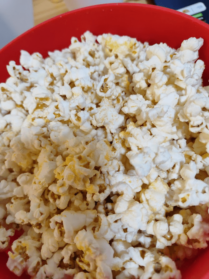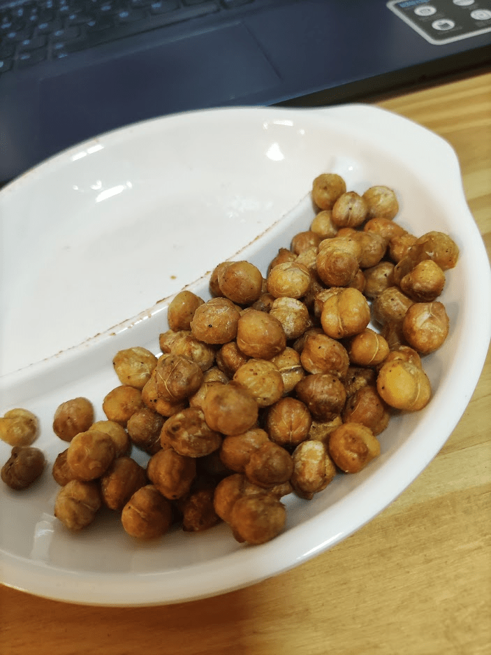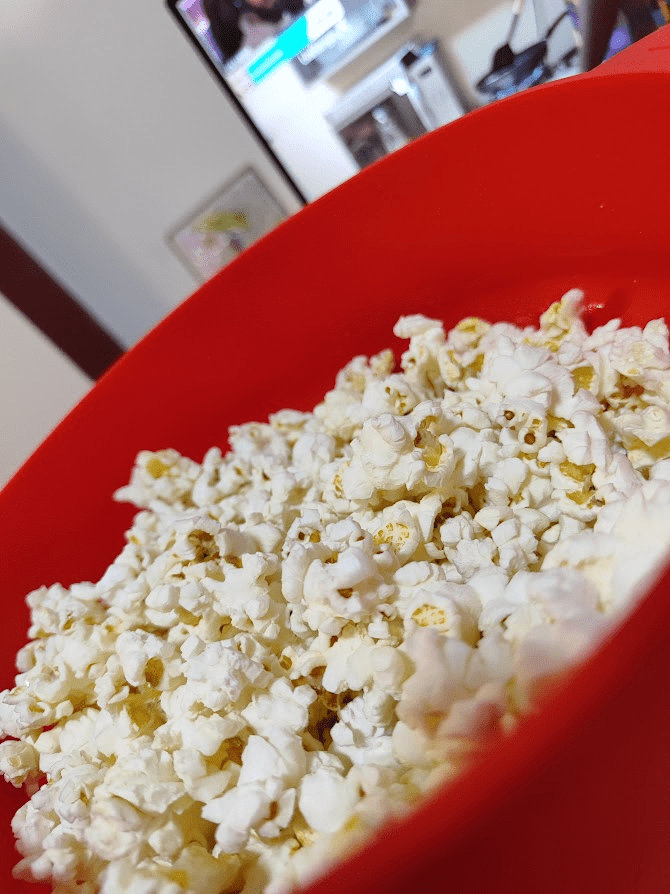 Não tenho fotos do grão de bico no almoço, porque não tinha um telefone celular para fotografá-lo, mas a essa altura o leitor já sabe e entende o conceito de grão de bico. De noite, pensei: e pipoca? isso entra na FMD? e pesquisei na internet, e disseram que sim, que tem muita fibra, que é saudável, algo sobre ser um amido resistente, e então fiz uma quantidade de pipoca com azeite que ficasse dentro das minhas calorias.