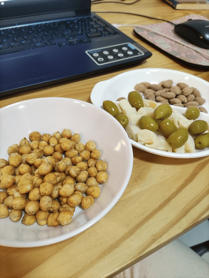 De noite foi comidinha de boteco, é preciso ser sincera e dizer que estava uma delícia, e que eu comeria grandes quantidades disso, (e acabei comendo mesmo, nos dias seguintes, e me arrependi de assim ter desejado), especialmente pela fome que passei no primeiro dia, mas já esperava que fosse passar, pois o dr. Longo nos alerta sobre isso e avisa que vai melhorar com o tempo. Azeitonas, castanhas, palmito (não achei nada que desabonasse), e meu favorito, petisco de grão de bico, também posso passar a receitinha.