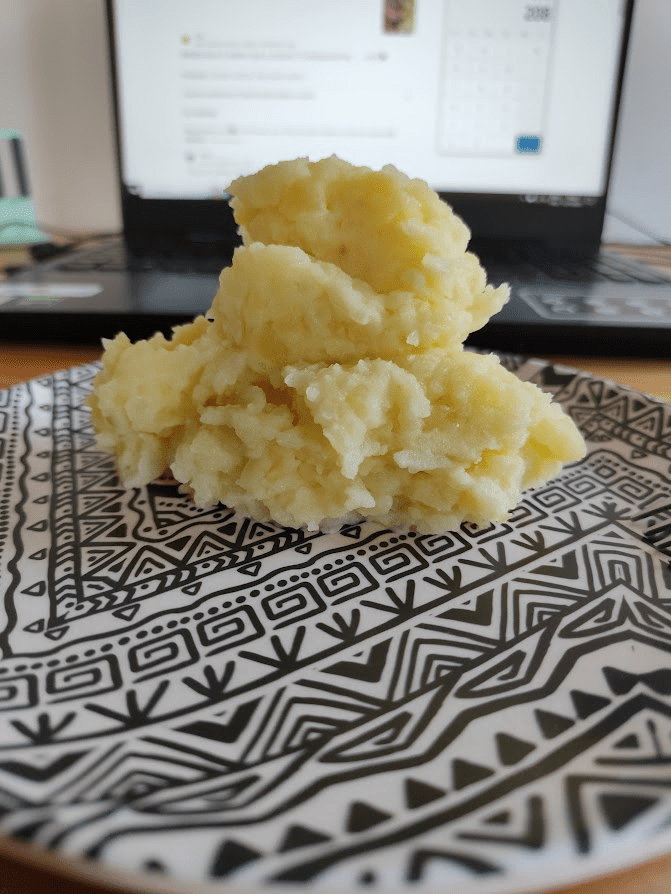 Para o almoço, queria usar o que já tinha na geladeira, então fiz um purê de batata na versão mais saudável que consegui, e não sei como o leitor pinta a imagem de um purê em sua cabeça, mas o meu é rústico e consistente, veja: