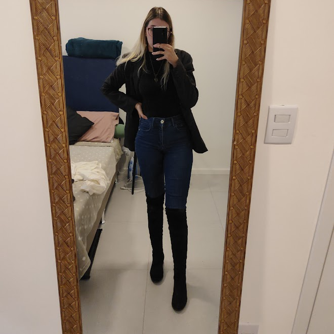 Steve Jobs x Mulher Elástica: absolutamente todas as vezes que uso essa blusa com golinha, junto com óculos, me sinto a própria fundadora da Apple. Aqui não tem segredo, para driblar o frio a dica é ótima, jogar uma dessas botonas acima do joelho para ganhar uma camada extra de calor e, se o conjuntinho todo for justinho, pronto, temos Helena Pêra, a mulher do Senhor Incrível. Aqui caberia um cinto, ficaria até melhor, mas nem sempre se tem saco de ficar adicionando um passo extra ao usar o banheiro.