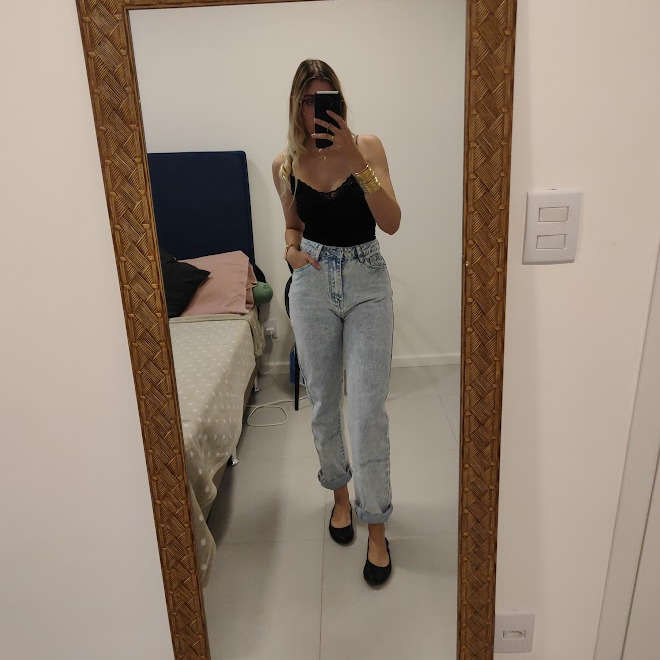 Basiquinha: aqui mostro um lookzinho bem basiquinha, uma calça jeans, regatinha preta, sapatilha e o bracelete de novo. Quando se fala em o poder dos acessórios eu acredito que este seja um bom exemplo. O poder do cabelo lavado também, no caso.