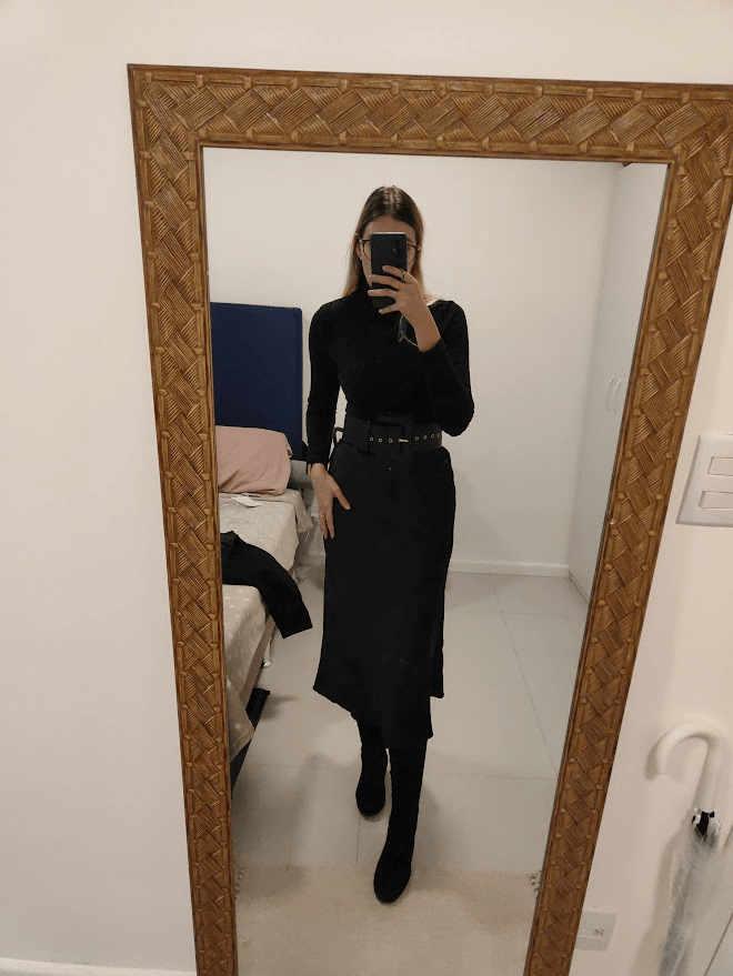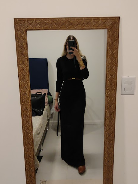 Chroma key, mas no preto: eu adoro me vestir de preto. Acho que muitas pessoas adoram. Já fiz meus testes de coloração pessoal e, embora preto não esteja na minha paleta de cores, eu não poderia ligar menos. O segredo para ter sucesso usando um look all black é misturar texturas e tecidos. Aqui, a bota é de camurça, a saia é de cetim, o cinto imita couro e a blusa é uma malha canelada. Por cima, coloquei um casaco de lã (no fim do dia, que já era noite, no caso, e fazia frio), também preto.