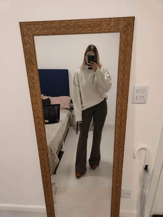 Ainda monocromática: desta vez utilizando cores que estão, sim, na minha paleta (e que por coincidência estão bastante em alta ultimamente – e será que estão em alta porque a coloração pessoal está em alta e assim muita gente percebeu que tons terrosos ficam mais bonitos na pele que preto e branco? indagações), me preparei para sair de casa em um dia frio usando essa calça de camurça, pesadíssima (linda, comprei em brechó online), essa botinha marrom que estou usando em mais de 50% dos dias, blusinha canelada e bem quentinha, e senti, sim, que faltou algo nessa seleção, mas paciência. De noite esfriou e eu joguei um suéter creme por cima, e aí acho que ficou bom.