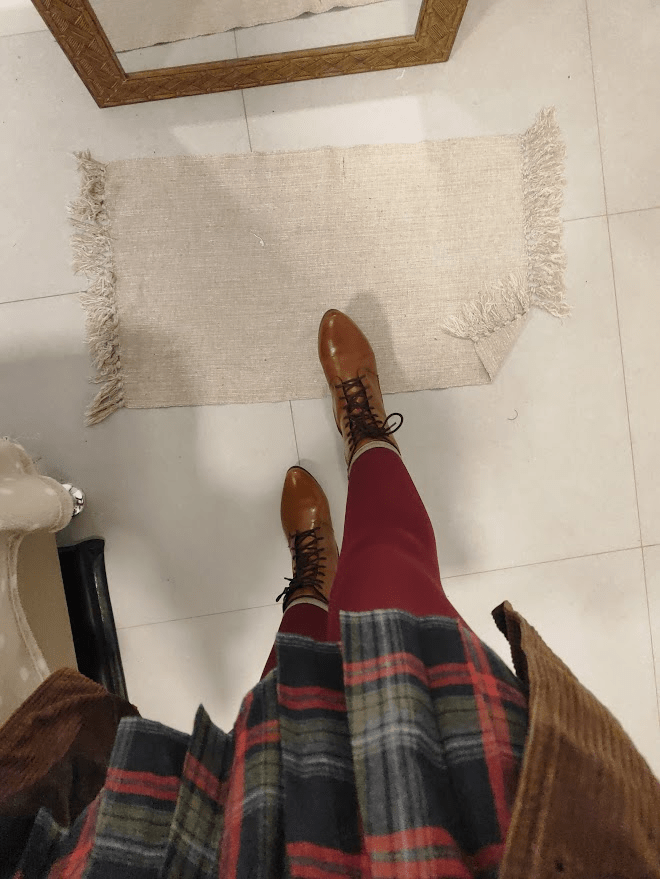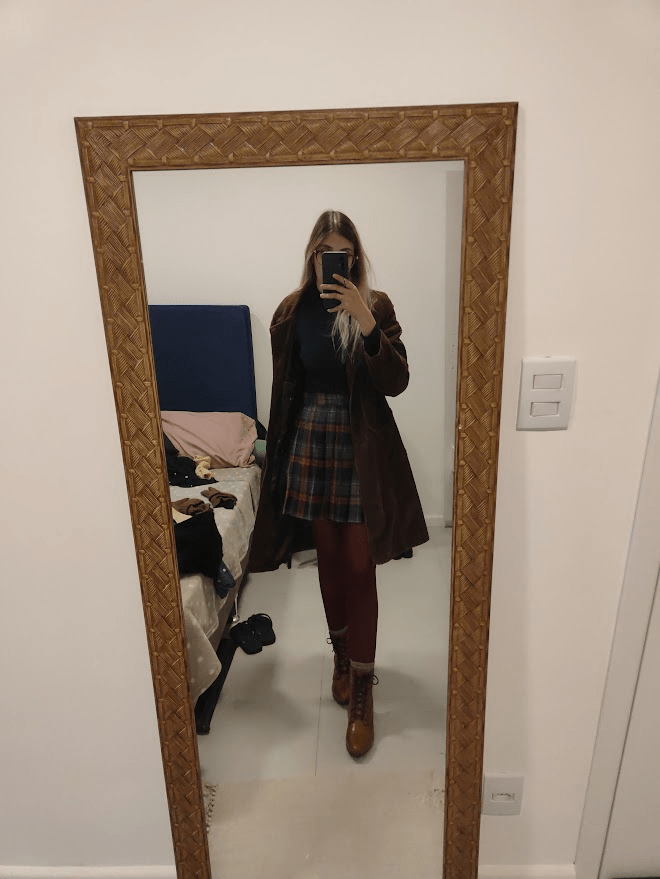 Amante de livros: embora pareça um look de ir até a biblioteca num pequeno país do leste europeu, essa combinação é especial porque decidi usá-la no dia da defesa do mestrado (não confundir com o look da defesa, que foi meu pijama de frio com um suéter preto por cima pra não ficar feio), ou seja, o que o leitor vê na foto é uma mulher leve, feliz, contente por ter finalmente encerrado mais um ciclo na vida. E poderia ser diferente? Estou usando uma blusa canelada verde-musgo, que combinou bem com a saia, toda plissadinha, uma fofura. A meia-calça vinho está por cima de outra meia, essa térmica, portanto não senti frio. A botinha marrom está aí de novo provando o que disse lá em cima. O sobretudo tem ao menos 15 anos.